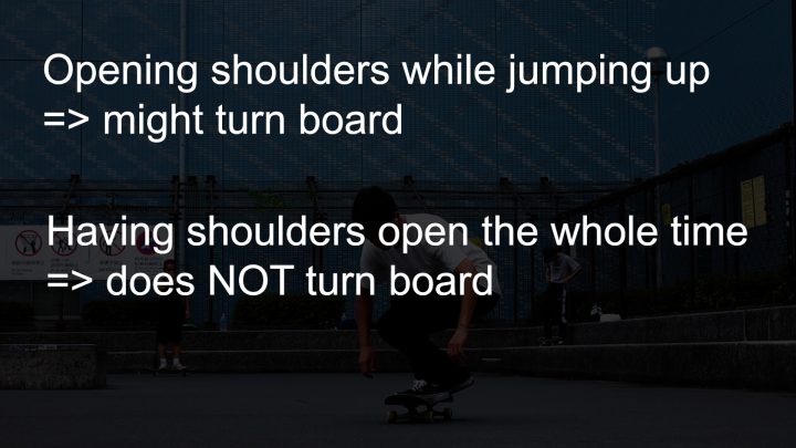 Although opening your shoulders while jumping up might give your board additional spin, having your shoulders at a certain angle the whole time does not.